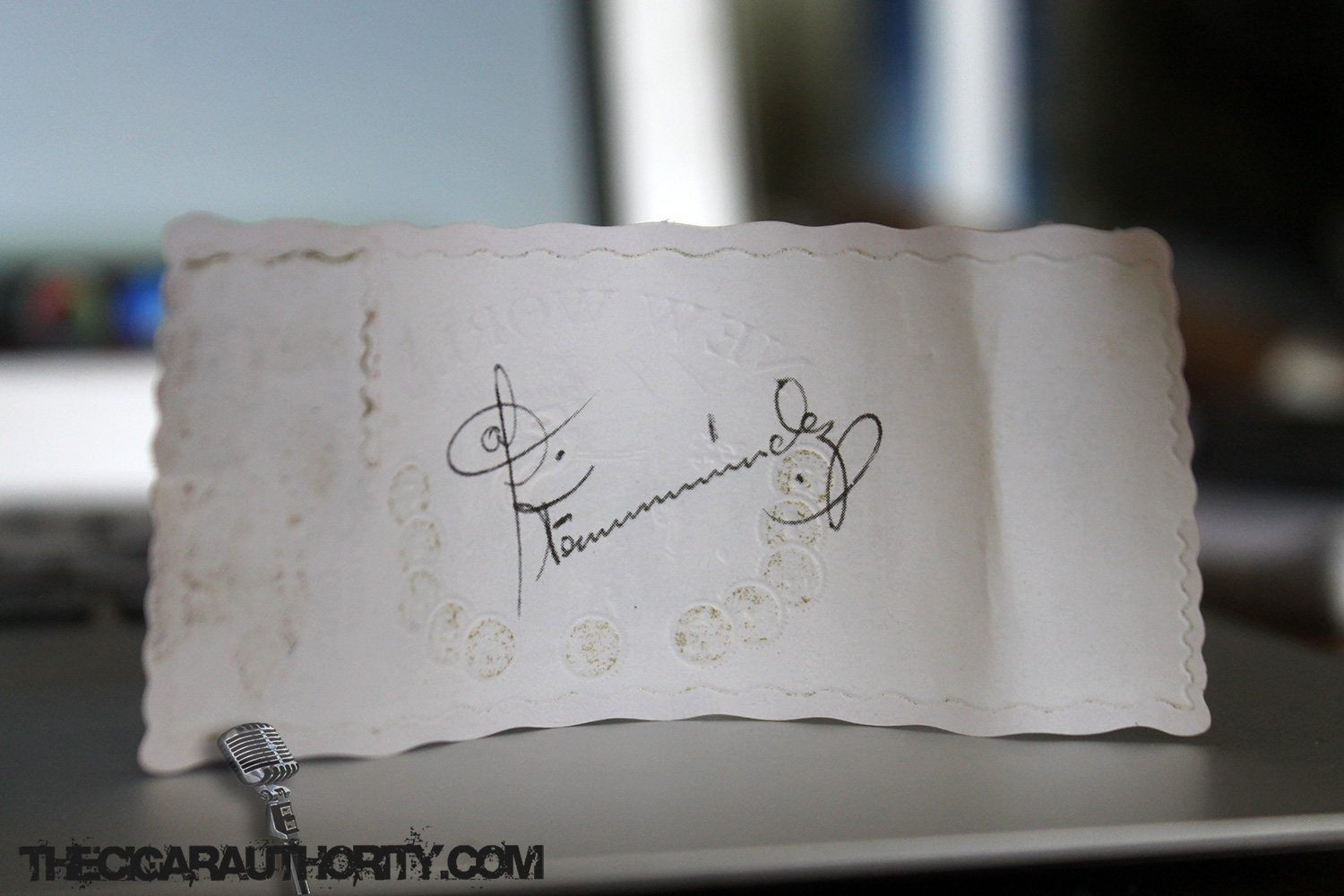 The Look: Looking at the wrapper of the cigar there is two different shaded at the first seam which detracts some from the beauty of the stick. The foot is covered by a white ribbon with red writing showcasing the AJ Fernandez logo and identifies the cigar as a Connecticut. The ban of the cigar is a work of art showing the arrival to the New World which is the name of the brand. In the hand the cigar is silky and firm. Once the band is removed there is a facsimile of AF Fernandez’s autograph that actually looks like it was signed in pen.
