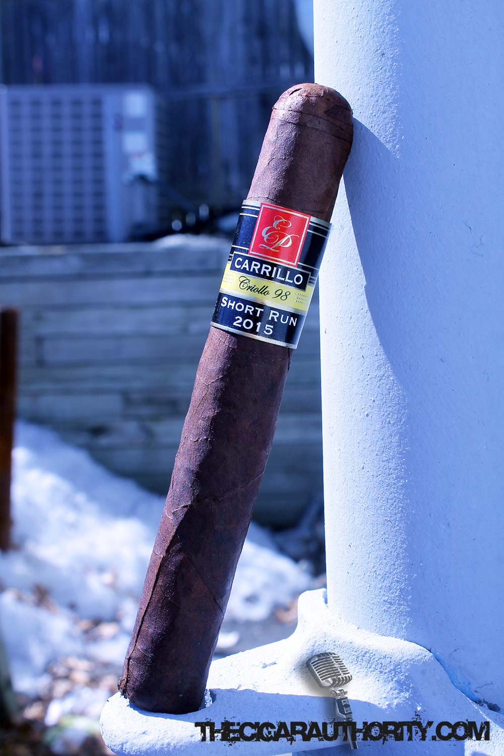 The Look: Despite this being listed as the Vencedores size it measure at 5.75″ and the cigar is available in a 5 x 50, 6 x 52 and 6 x 60. The dark wrapper has faint brindle effect to it and the roll is porous with one thick vein running the length of the cigar. The band of gold, black, yellow and red is a nice redesign of the original EP Carrillo bands and the mention of Criollo 98 on the band is nice and unlike years past where the Short Run as a secondary band this year it is attached as one. The wrapper has some tooth to it and little crystals on it. In the hand it feels gritty and light.