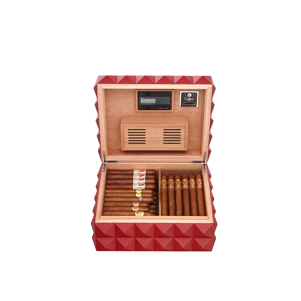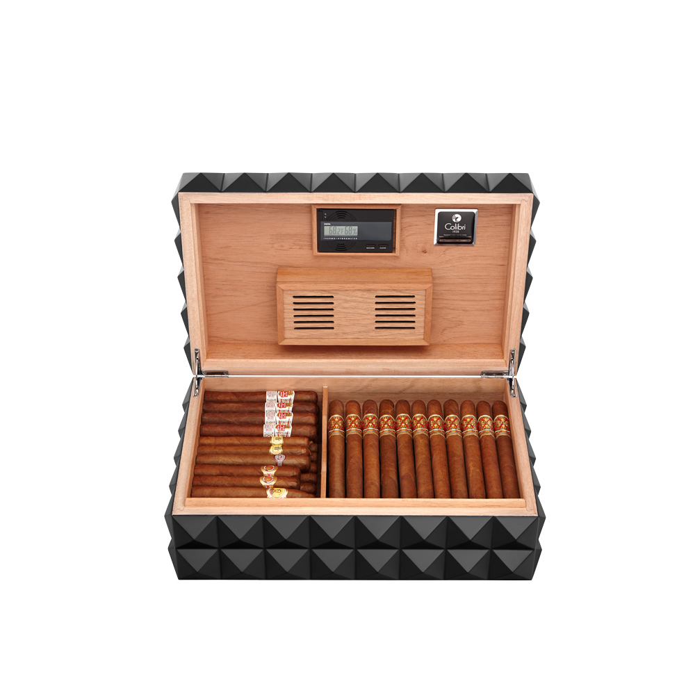In addition, two new 12” wide models (100-125 cigar capacity) will be introduced in two new colors, a metallic black and a matte red. Only 200 units of each will be produced. Each will be serialized on the Colibri plaque located on the inner lid. Suggested retail is $1,500.