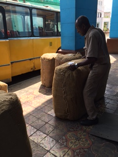 We all went for the full factory tour which includes every aspect of the process including seeing them unloading a bus filled with bales of tobacco from the farms we has passed in Pinar del Rio. I snap a quick shot of the bale and label stitched on top to get it translated because this could answer some of my questions.