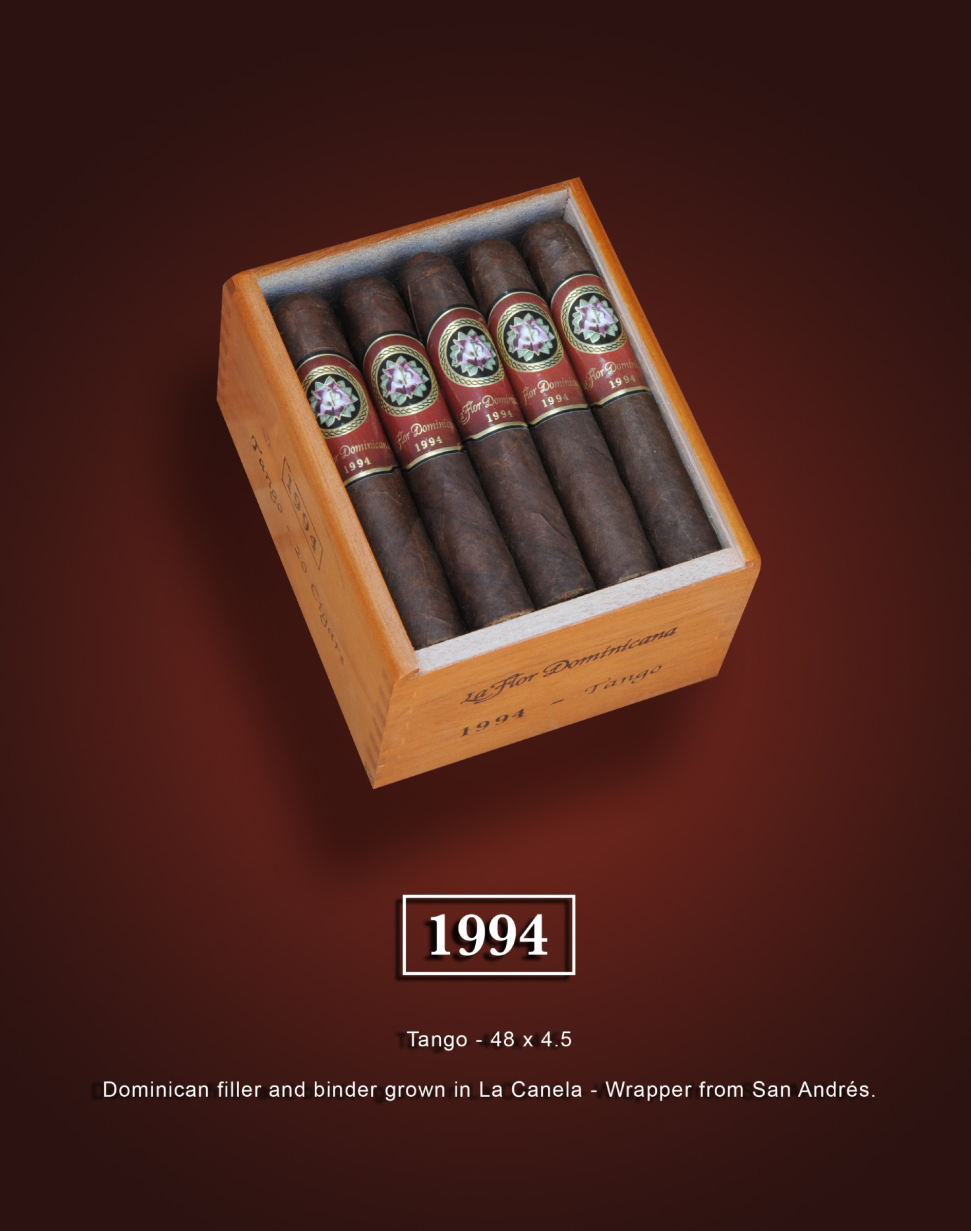 Our 1994 line, created to commemorate our 20th year as cigar manufacturers is receiving a new size. The 48 x 4 1/2″ Tango features the same blend of a Mexican San Andrés wrapper and Dominican fillers and binder from our farm in La Canela.
