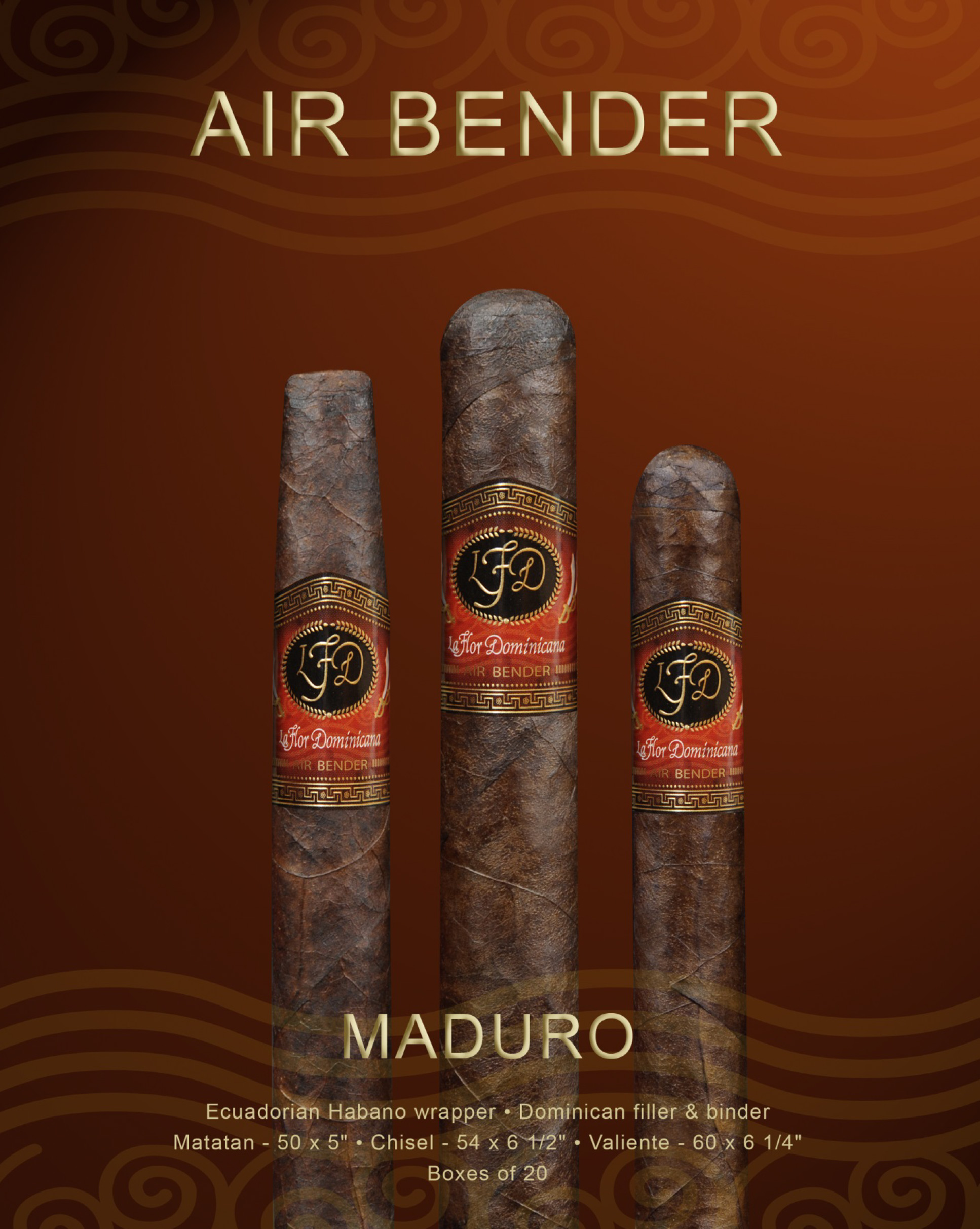 Bending the air is a ritual. Enjoying a fine cigar and watching its smoke bend and curve through the air around it; it is something we all love to do, and the Air Bender is a cigar blended for every smoker. Medium‐full in strength and plentiful in flavor, three sizes of our classic Habano blend are now available in maduro.