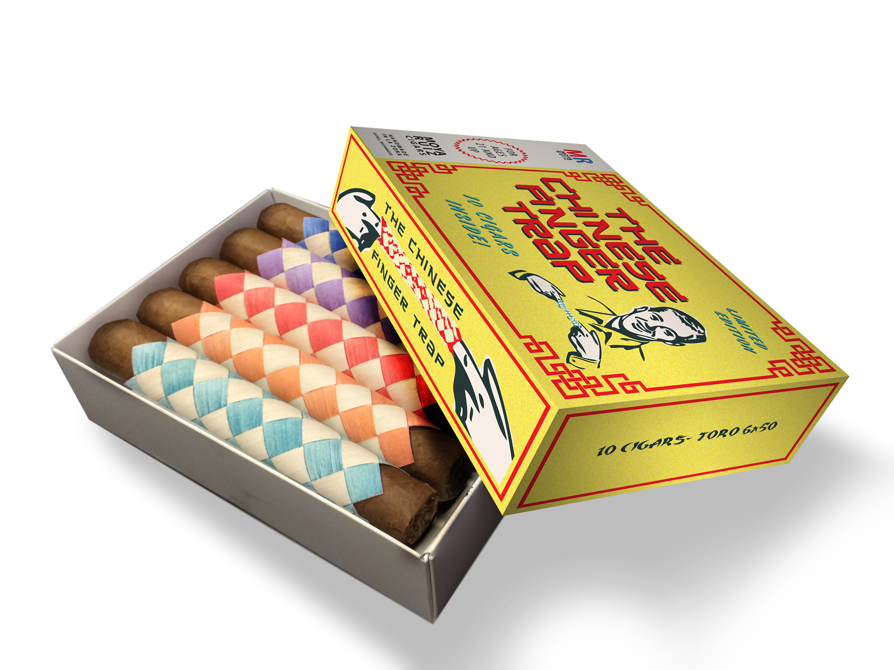 Danny Moya, co-founder of MoyaRuiz Cigars explained the concept behind the Chinese Finger Trap: “We had such a blast making last year’s limited edition release, the Nunchuck, so we knew that this year we had to once again think outside the box. Although this release also has an oriental theme, its packaging is inspired mainly by vintage novelty/game boards the Chinese finger traps came in.”