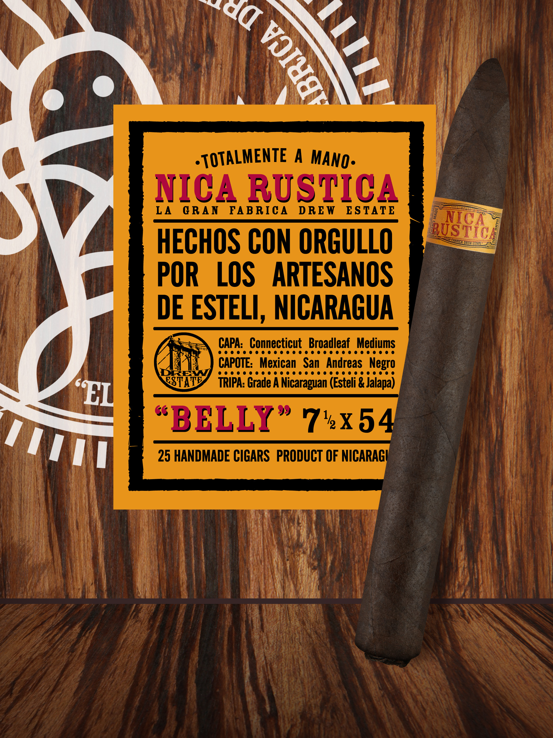 Jonathan Drew, from Managua, Nicaragua stated, “Nica Rustica is a tribute to Estelí’s hard working cigar culture. Behind all the glitz and glam, there are thousands of factory Buncheros and Rolleros who keep their game strong and consistent to maintain Estelí, Nicaragua’s respected stature of ‘Mecca of Cigars’. The long awaited size, ‘Belly’, is a king of a Belicoso at an affordable price.”